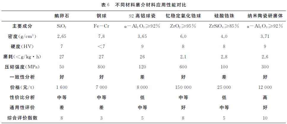 納米陶瓷研磨體在研磨行業中的地位和作用在現有的磨介材料中,除越來越少的天然鵝卵石外,其他都是人造材料。如,鋼球、氧化鋁球、氧化鋯球、硅酸鋯珠、硅珠(玻璃珠)等,其應用性能列表對比見表6。判斷磨介在實際應用中的優劣最主要的是其適用性和經濟指標。從表6可知,納米陶瓷研磨體是綜合性能最佳的品種,在市場中其應用潛力最大。